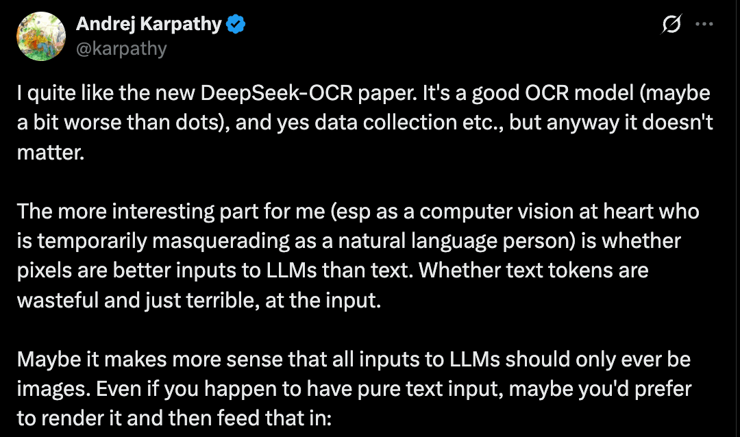 In simpler terms: imagine a 10,000-word document. A normal language model processes 10,000 tokens. DeepSeek’s approach might encode that into just ~1,000 visual tokens — a 10× compression! Remarkably, it can still output text at ~97% accuracy on standard benchmarks when compressed by 10×. Even at 20× (really crushing it down), it’s about 60% accurate — still useful for many tasks. This means faster inference with fewer computational steps. As one researcher put it, DeepSeek asks “are pixels better inputs to LLMs than text?”