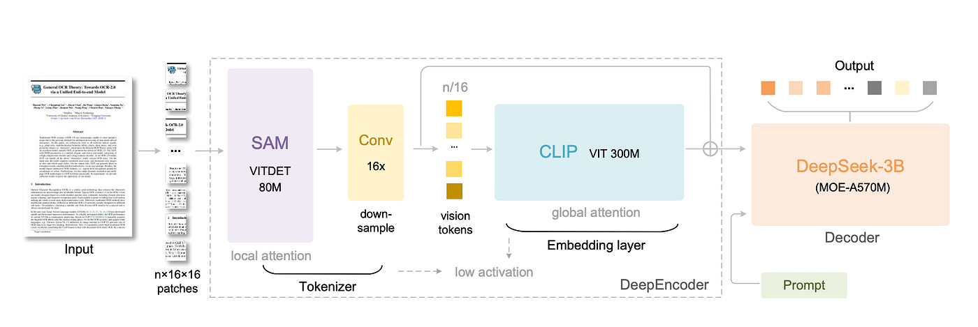 DeepEncoder: This is a custom image encoder with about 380M parameters. It’s built from two known pieces and a clever bridge. First, a SAM-based model (80M params) with windowed attention handles local visual details. Second, a CLIP-Large model (300M params) handles global context with full attention. Connecting them is a 16× Token Compressor (a stack of convolutions) that squashes thousands of patch tokens into just a few hundred “vision tokens.”